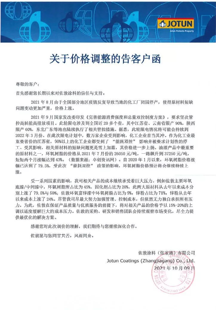 受一系列因素的影響,我司相關(guān)產(chǎn)品的成本繼續承受著(zhù)巨大壓力。例如佐敦主要環(huán)氧底漆/中間漆中,環(huán)氧樹(shù)脂所占比為45%,固化劑占比為20%,此兩大原材料從去年以來(lái)成本分別上漲了79.5%與50%;佐敦環(huán)氧富鋅漆中環(huán)氧樹(shù)脂占比為9%,鋅粉占比為71%,鋅粉從去年以來(lái)成本上漲了24%。盡管我司盡最大努力加強管理、控制成本,但依然無(wú)力獨自承擔所有壓力。為此,佐敦在保證產(chǎn)品質(zhì)量與優(yōu)質(zhì)服務(wù)的前提下,將對相關(guān)產(chǎn)品的價(jià)格予以15%-20%的上調以適度緩解巨大的成本壓力。佐敦的采購、研發(fā)和銷(xiāo)售團隊會(huì )持續觀(guān)察市場(chǎng)變化,盡全力提供最優(yōu)化的解決方案。